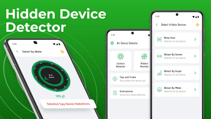 The Hidden Camera Detector Finder: Bug Locator uses your phone's magnetic sensor to detect devices. Open the Hidden Microphone Detector App and move your phone near any suspicious area. The Hidden Device Detector app will alert you with beeping and vibration when it finds a secret device. This amazing Spy Device Detector app will keep you protected whether you're using it in a bedroom, bathroom, or any sensitive location.