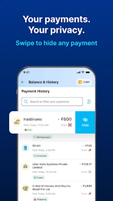 ● Built-in privacy: hide/unhide payments, personalised UPI ID, QR scan without sharing number, no OTP card swipes